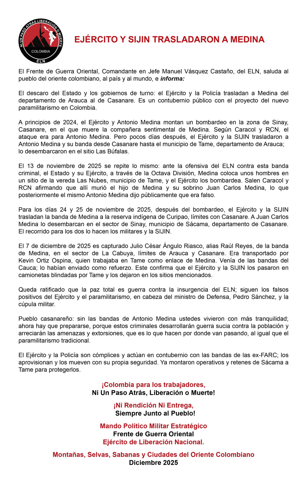 Para los días 24 y 25 de noviembre de 2025, después del bombardeo, el Ejército y la SIJIN trasladan la banda de Medina a la reserva indígena de Curipao, límites con Casanare. A Juan Carlos Medina lo desembarcan en el sector de Sinay, municipio de Sácama, departamento de Casanare. El recorrido para los dos lo hacen los militares y la SIJIN.