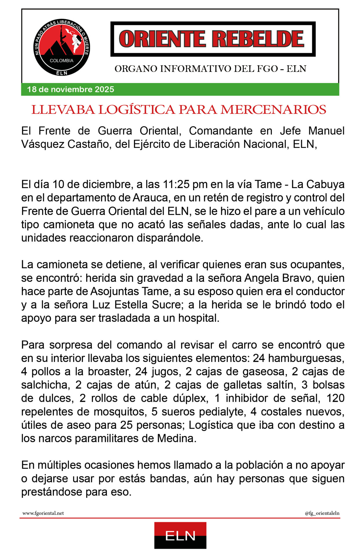 El Frente de Guerra Oriental, Comandante en Jefe Manuel Vásquez Castaño, del Ejército de Liberación Nacional (ELN), informa que: