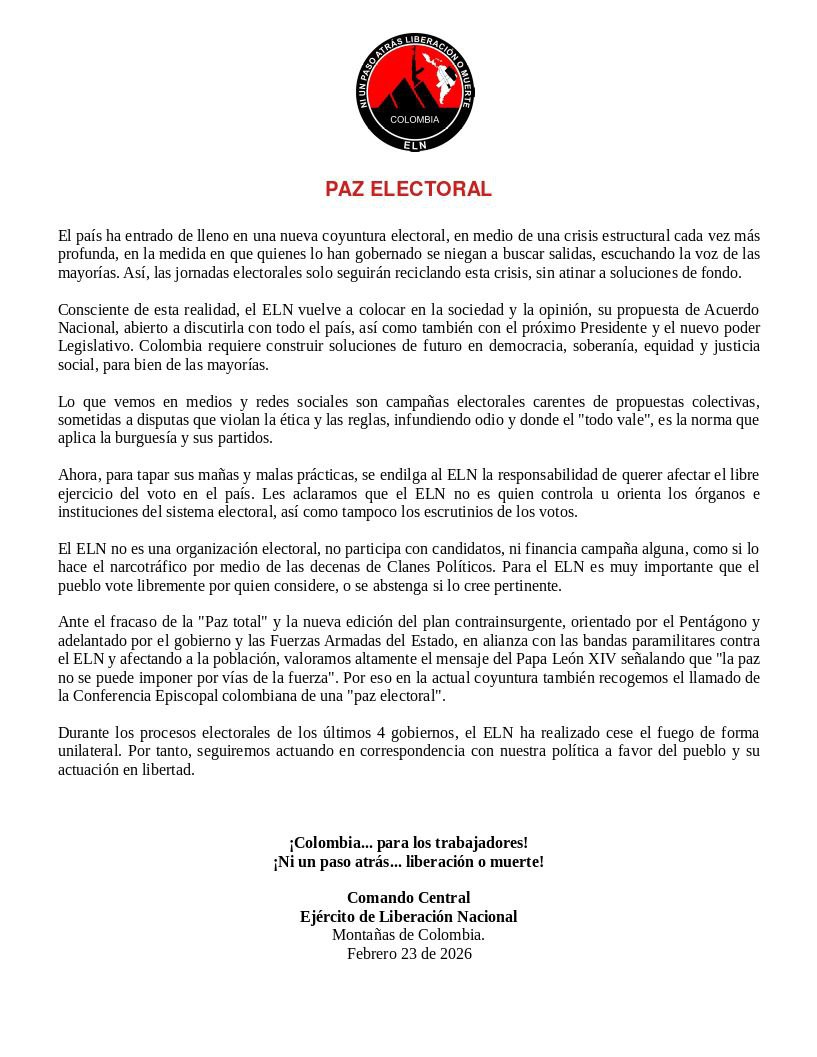 El ELN denuncia que las elecciones en Colombia reflejan una crisis estructural sin soluciones reales, dominadas por campañas carentes de ética y coherencia. Reafirma su propuesta de Acuerdo Nacional para construir una democracia basada en soberanía y justicia social. El ELN niega control sobre el sistema electoral y afirma su compromiso con la libre elección del pueblo. Aprovecha el llamado a una «paz electoral» y reitera su historia de cese unilateral del fuego durante procesos electorales. Finalmente, enfatiza su lucha a favor del pueblo y su independencia política.Cocoon AI Summary