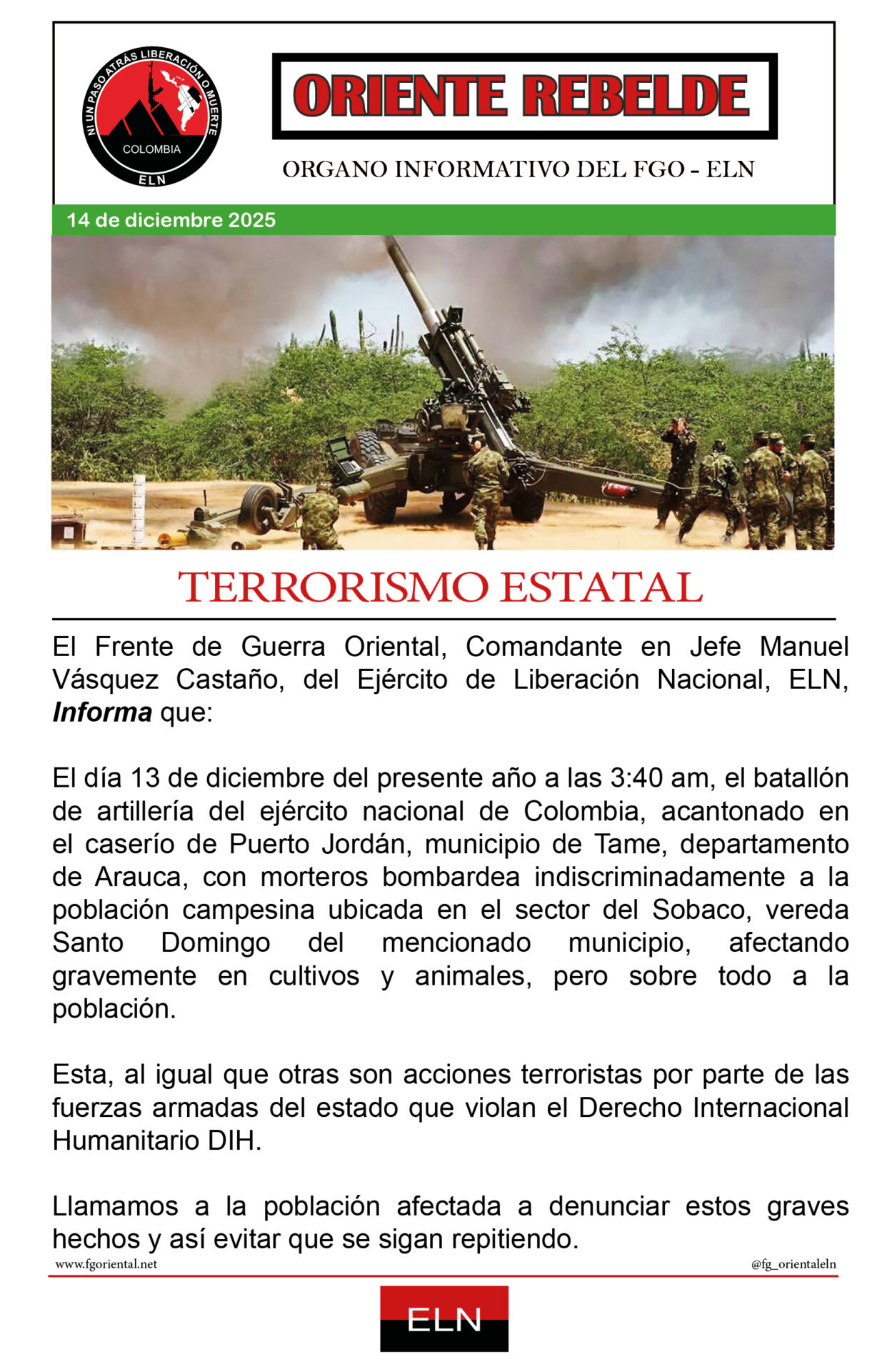El día 13 de diciembre del presente año a las 3:40 am, el batallón de artillería del ejército nacional de Colombia, acantonado en el caserío de Puerto Jordán, municipio de Tame, departamento de Arauca, con morteros bombardea indiscriminadamente a la población campesina ubicada en el sector del Sobaco, vereda Santo Domingo del mencionado municipio, afectando gravemente en cultivos y animales, pero sobre todo a la población.