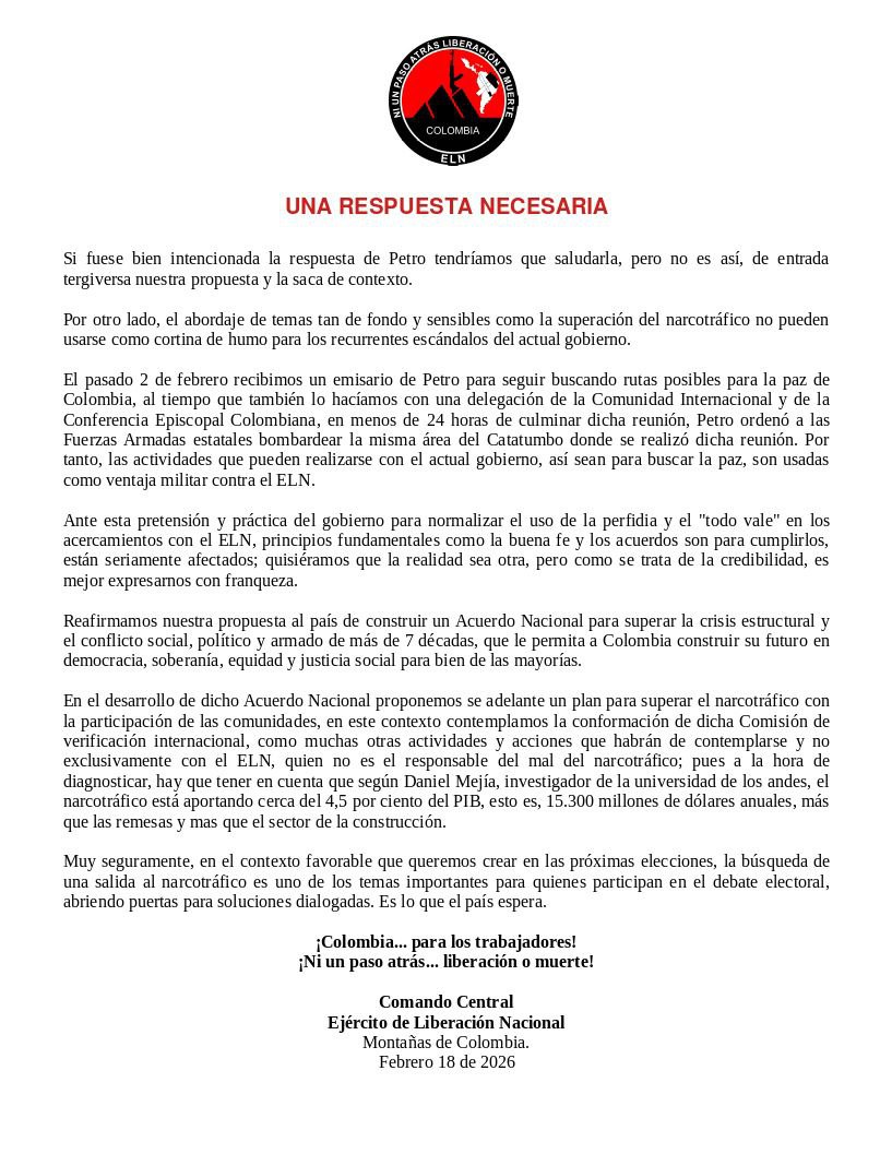 El pasado 2 de febrero recibimos un emisario de Petro para seguir buscando rutas posibles para la paz de Colombia, al tiempo que también lo hacíamos con una delegación de la Comunidad Internacional y de la Conferencia Episcopal Colombiana, en menos de 24 horas de culminar dicha reunión, Petro ordenó a las Fuerzas Armadas estatales bombardear la misma área del Catatumbo, donde se realizó dicha reunión. Por tanto, las actividades que pueden realizarse con el actual Gobierno, así sean para buscar la paz, son usadas como ventaja militar contra el ELN.